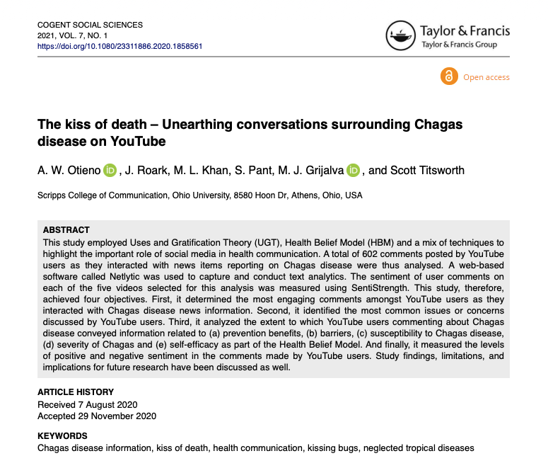Otieno, A.W., Roark, J., Khan, M.L., Pant, S., Grijalva, M.J., & Titsworth, S., (2020). The Kiss of death – Unearthing conversation surrounding Chagas disease on YouTube, Cogent Social Sciences, 7:1