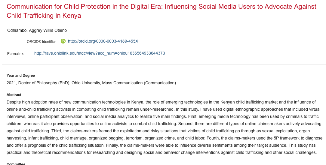 Otieno, AW., (2021). Communication for Child Protection in the Digital Era. Influencing Social Media Users to Advocate against Child Trafficking in Kenya. http://rave.ohiolink.edu/etdc/view?acc_num=ohiou1636564933644373